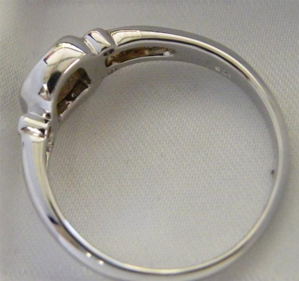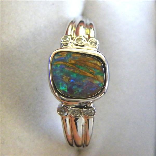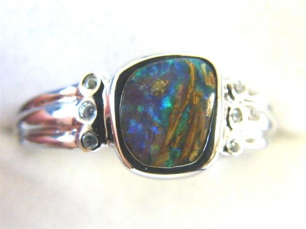 Set in solid sterling silver and from our mine in the Quilpie district in western Queensland comes this pipe opal with natural adhering sandstone still on the back. Pipe opal occurs when fragments of tree roots or any organic material are trapped in sediments on an opal level and in time some of resulting cavities are replaced by potch or precious opal. The sandstone has been stabilised with a polymer resin to increase durability. There are bright green flecks within the opal and natural flaws. It is bezel set with three cubic zirconias on either side.