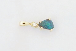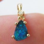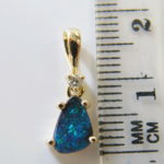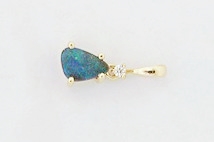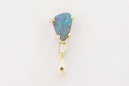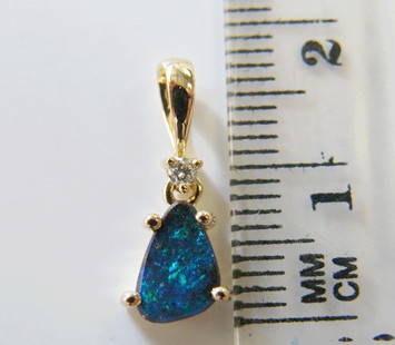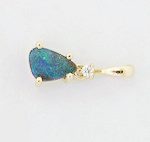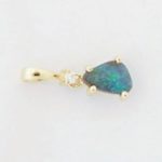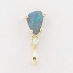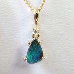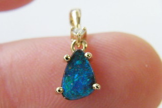 Natural Australian boulder opal from western Queensland. It is claw set in solid 14K yellow gold with 0.024ct diamond. The colour is more green than blue (like the first picture). Comes with a gold plated chain