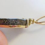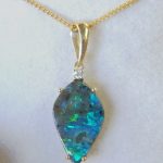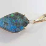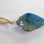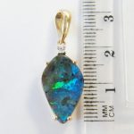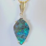 Flashes of green are move across the face of this natural Australian boulder opal from our mine in western Queensland (not quite as bright as the pictures show). It is claw set in solid 14k yellow gold with a 0.023ct diamond and swinging bail. Comes with a yellow hard gold plated on sterling silver chain.