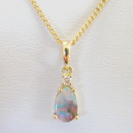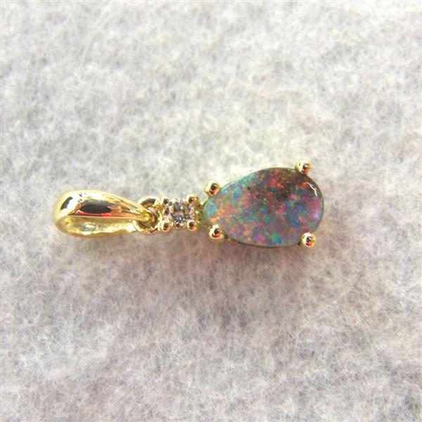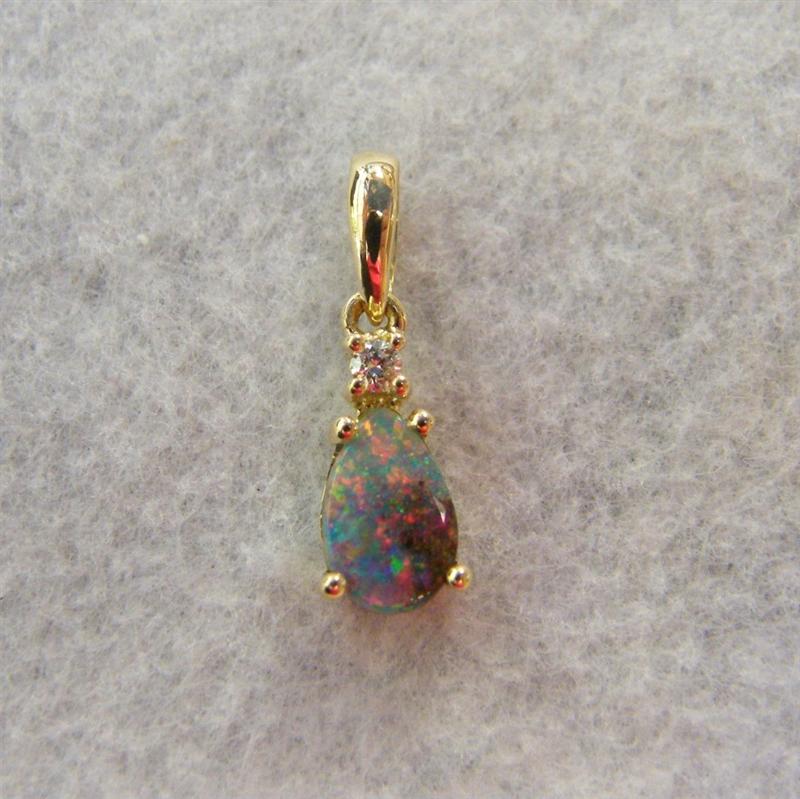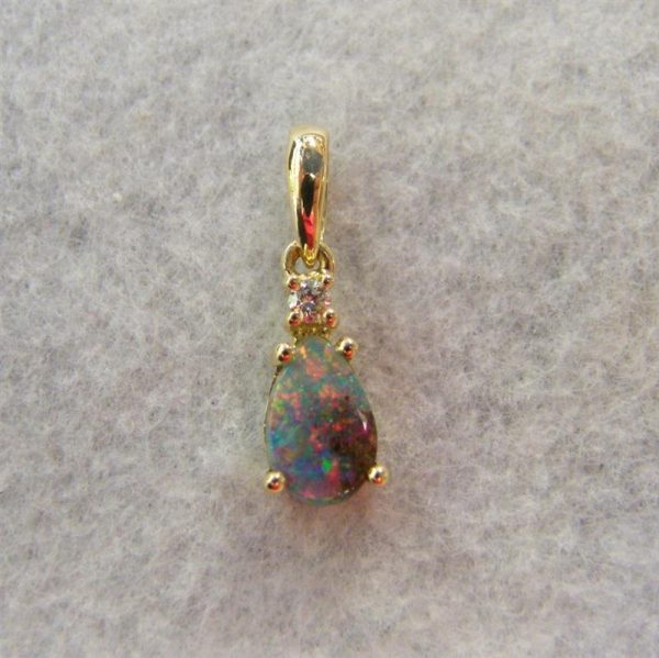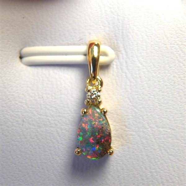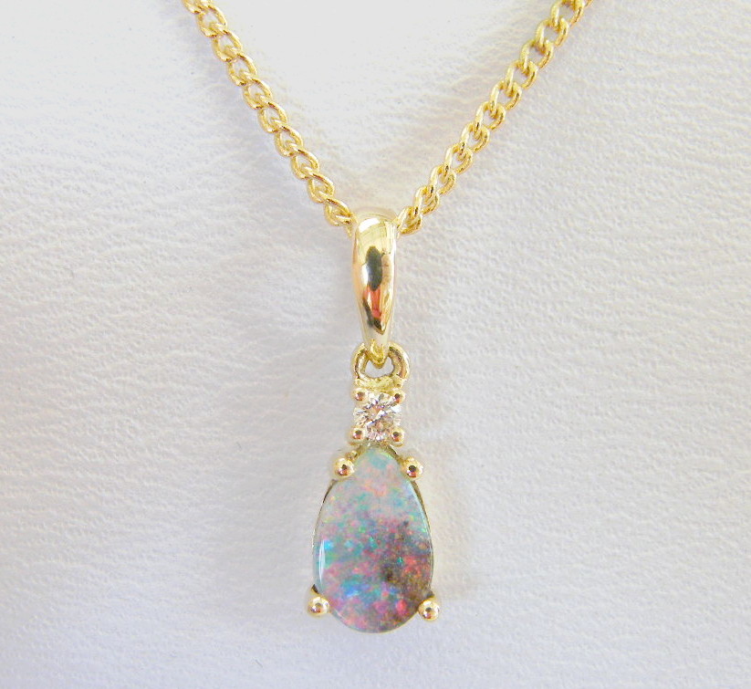 From our mine in western Queensland we found this pretty magenta and blue sparkly boulder opal. It is quality crafted in solid 18ct yellow gold with swinging bail and 0.028ct diamond. The opal is a natural boulder opal NOT doublet.