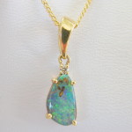 Quality crafted solid 18K yellow gold diamond and natural Australian boulder opal pendant(not a doublet). The opal is from our mine in the Quilpie district in western Queensland.The opal has very fine flaws due to too much pressure when setting. This does not hinder the wearing or beauty of this pendant, but because of the flaws we offer them at a reduced price. Comes boxed with a gold plated chain.