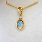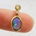 Pretty green solid Australian pipe boulder opal set in 18k solid yellow gold. It is bezel set with a 0.023ct diamond and swinging bail. The opal is almost solid crystal with a very small amount of the host sandstone still adhered to the back of the opal.