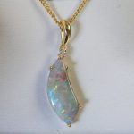 The opal was found on our mine in western Queensland and weighs 2.81cts. It is claw set in solid 18yg with 1 x 0.025cts diamond and swinging bail. It comes with a hard gold plated silver chain.