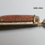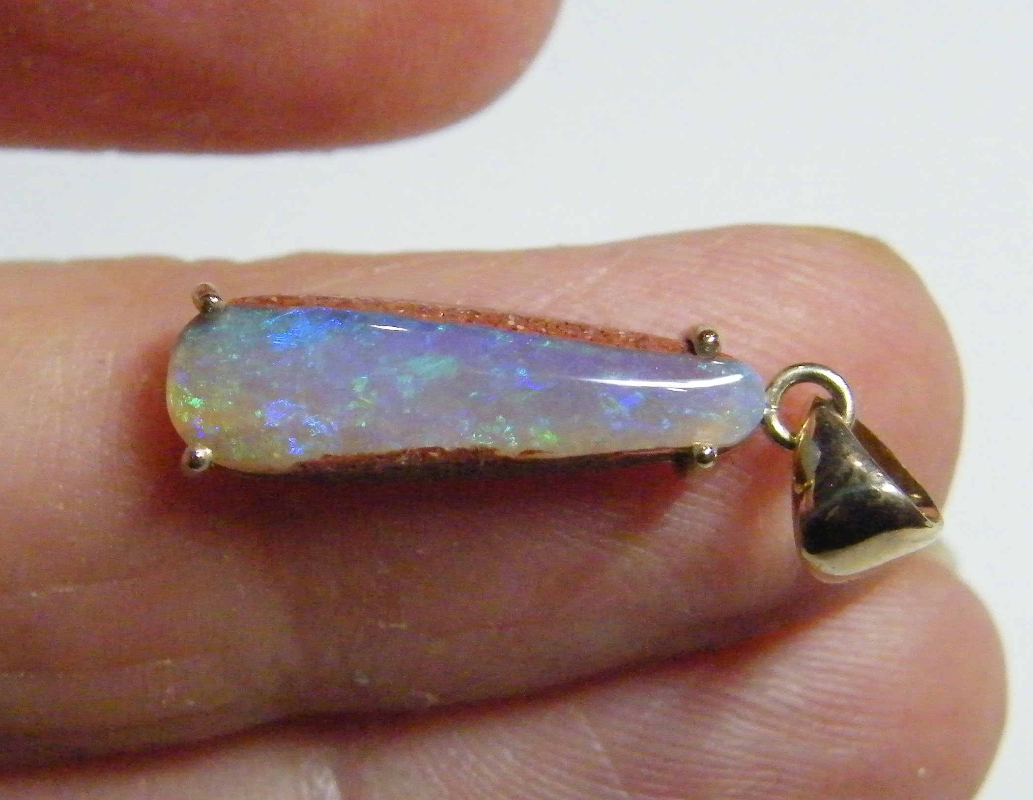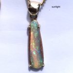 Green flecks sparkle from this natural Australian pipe opal from our mine in western Queensland. There is a small amount of sandstone on the side of this opal to enhance it’s character. This opal is set in solid 9k yellow gold with swinging bail and comes with a hard gold plated chain.