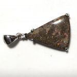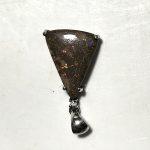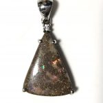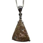 Multicolours flash through the ironstone of this natural Australian boulder opal from our mine in western Queensland. It is claw/prong set in 925 solid sterling silver and enhanced with a cubic zirconia. Comes with a 42cm solid sterling silver chain.
