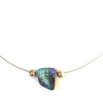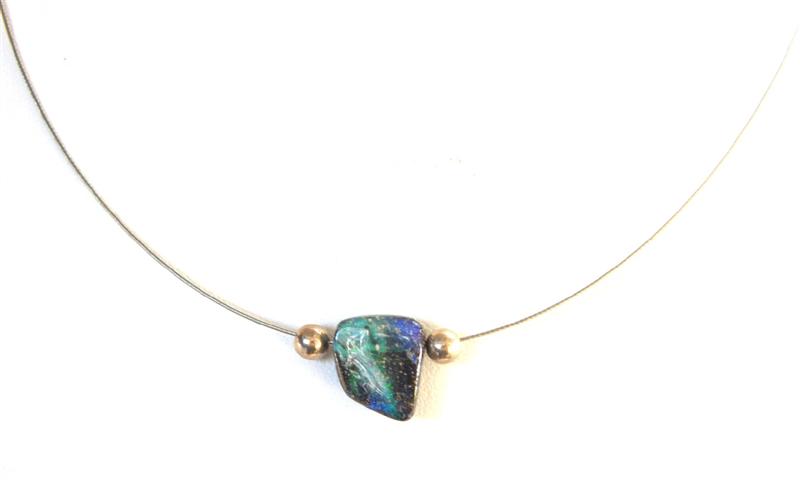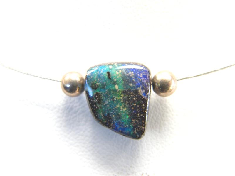 Solid Australian boulder opal in green/blue. It has a 1mm hole drilled through sideways and placed on a nylon coated stainless steel wire with sterling silver beads and fittings. Pendant length is 43cm.