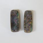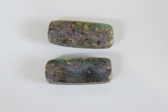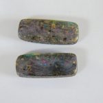 Pair of Australian boulder opal which can be set as earrings. They are dark in colour with a hint of green and pink flecks. They weigh a total of 2.35cts.