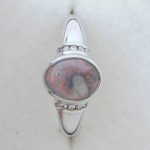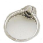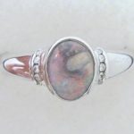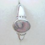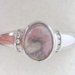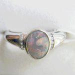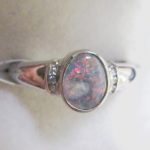 Pink and grey sparkle from this solid Lightning Ridge black opal. It has been rubover (bezel) set in solid 925 sterling silver. The opal has a dark grey swirl around one section of the opal and the inside that is more pastel in colour. There are five cubic zirconias set on either side of the stone. The opal is N4 in body tone according to the Opal Association body tone guide.