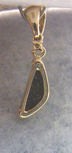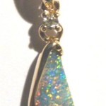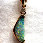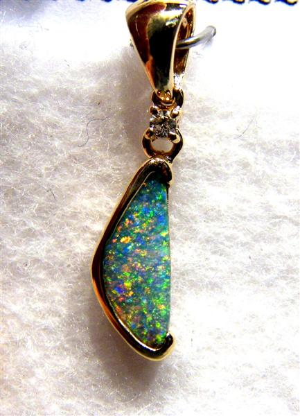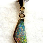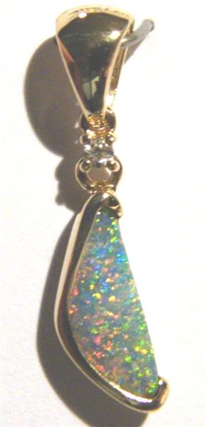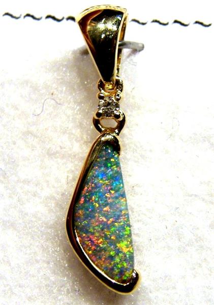 This brightly coloured solid Queensland boulder opal has been individually selected and handcrafted in 14K yellow gold with 0.023ct diamond. The pendant has a swinging bail and comes with a gold plated chain. Any questions please don’t hesitate to contact us.Picture 4 shows back of stone.