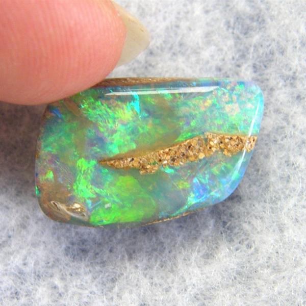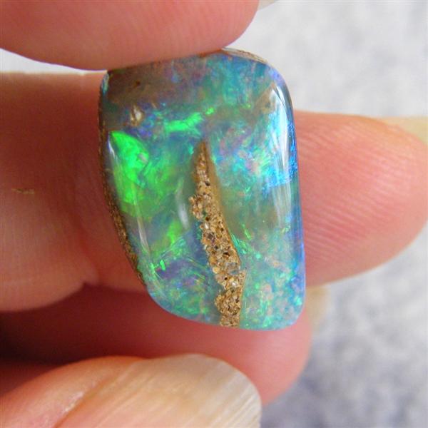 Bright green flashes are seen in this natural Australian pipe opal as it is moved about. The sandstone on the back of this opal has been stabilised with a polymer resin to give it durability. It also has a sandstone bar in the face of the opal.