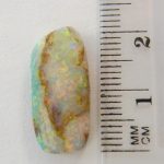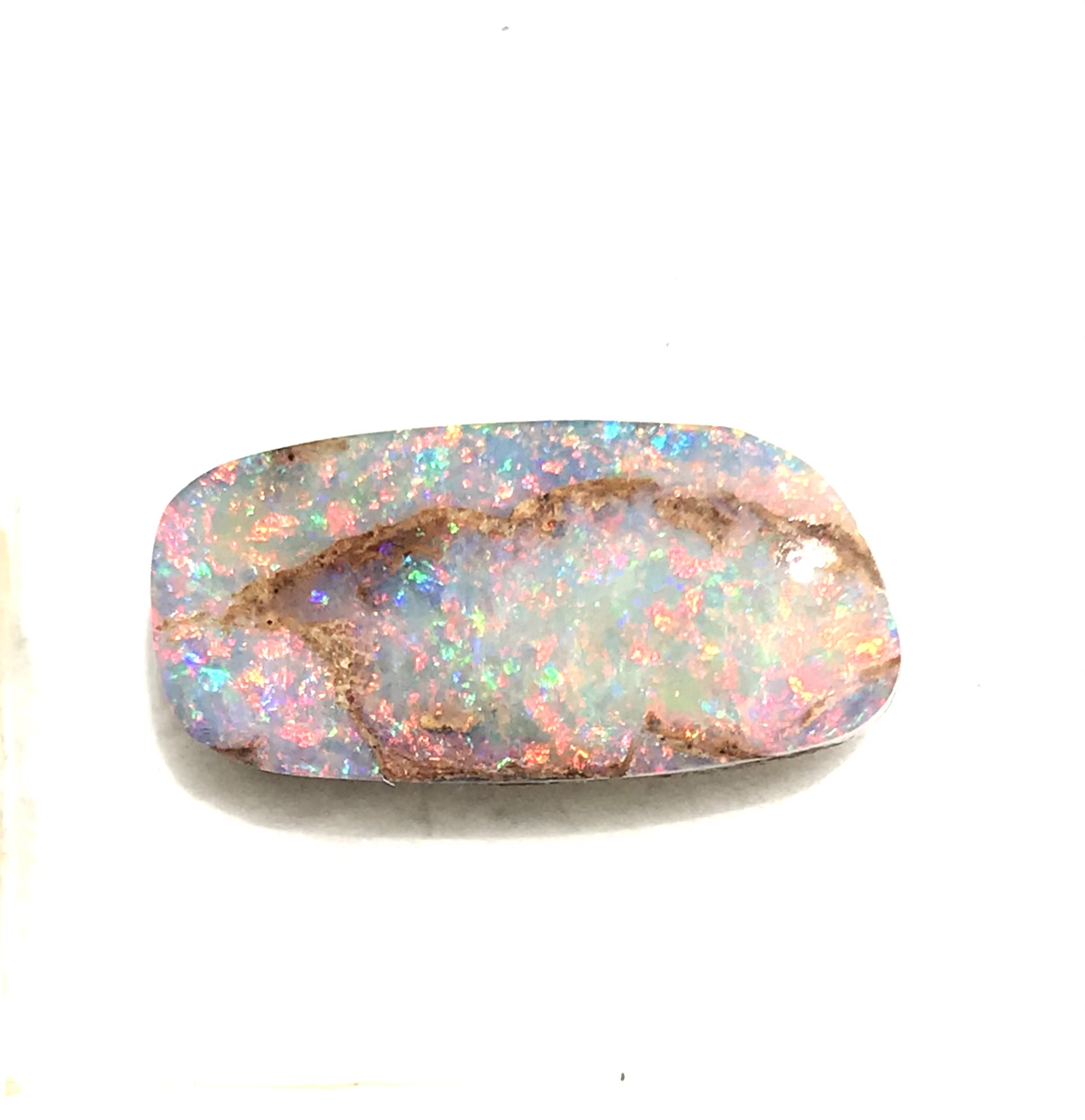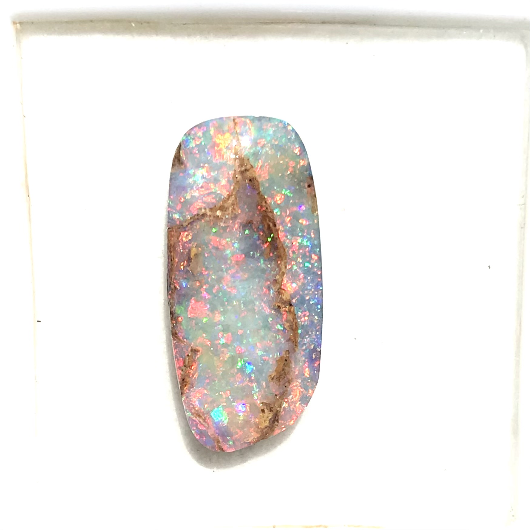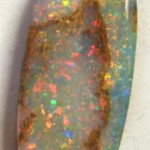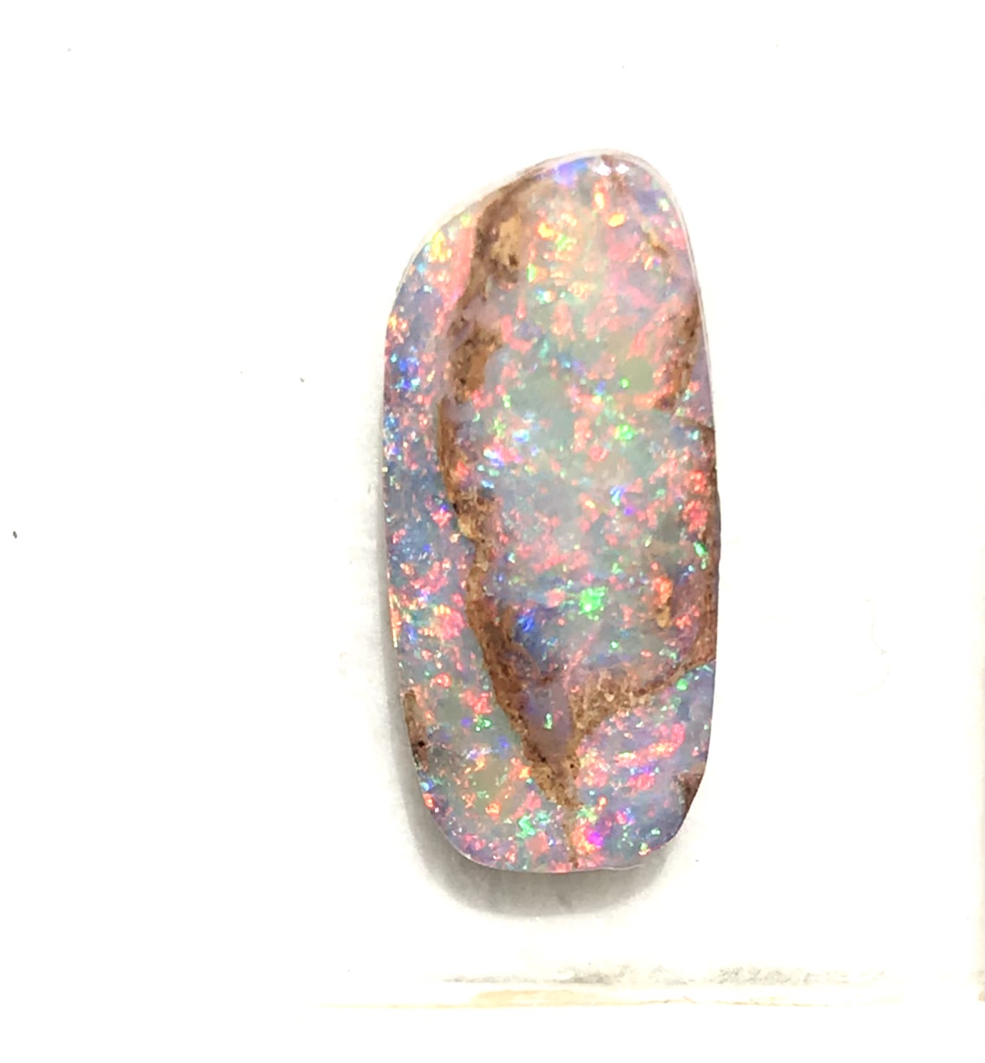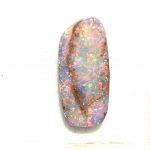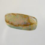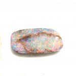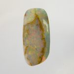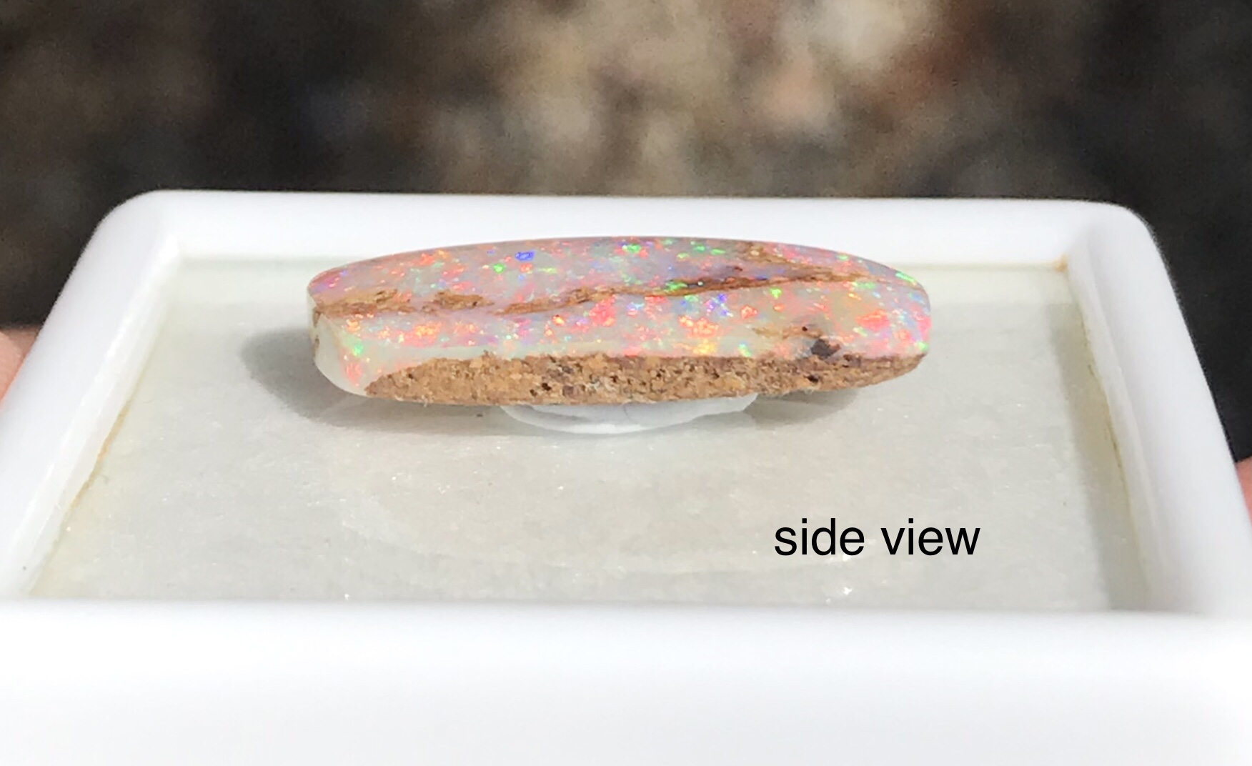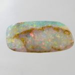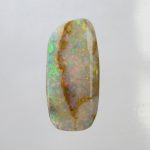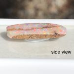 Bright flecks of orange and green are constant in this natural Australian pipe opal. Pipe opal occurs when old tree roots in the sandstone has been replaced by precious opal. The sandstone on the back of this opal has been stabilised with a polymer resin to give it durability. There are small sandstone inclusions in the face of the opal.