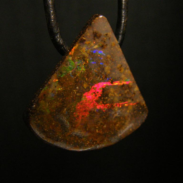 Amazing colours and patterns are seen in this solid boulder opal from our mine near Quilpie in western Queensland. It has a 3mm hole drilled through sideways.It is placed on a 2mm black leather to your desired length.