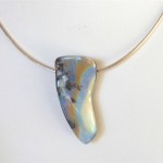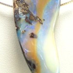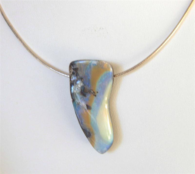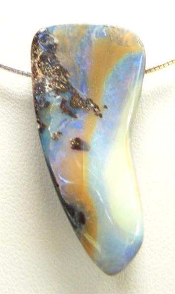 Natural Australian boulder opal from our mine in western Queensland comes this interesting and unique boulder opal. It has green flashes of colour through the opal (much greener and brighter than the pictures)with a caramel bar and some ironstone still in the face. It has a slight undulating surface and there are natural flaws in the opal. It has a 3mm hole drilled through sideways and is placed on a sterling silver omega. Comes with FREE silver polishing cloth.