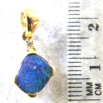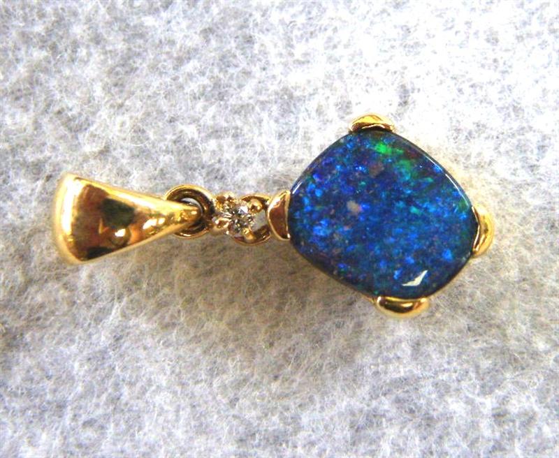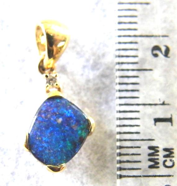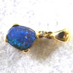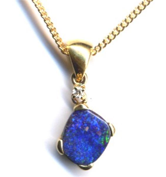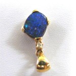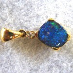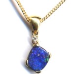 Quality crafted with swinging bail in solid 14 carat yellow gold. Natural boulder opal pendant (not a doublet) with 0.023ct diamond. The opal is showing bright blue and green sparkles (more green than the pictures show). The opal is from our mine in the Quilpie district in western Queensland. There are minor flaws in the opal. This opal pendant comes with a gold plated on sterling silver chain and GIFTBOXED.
