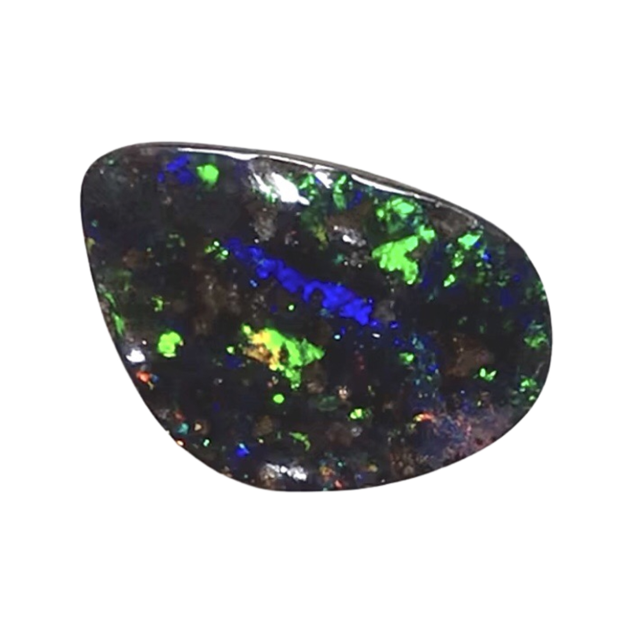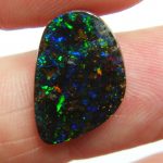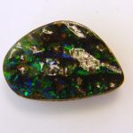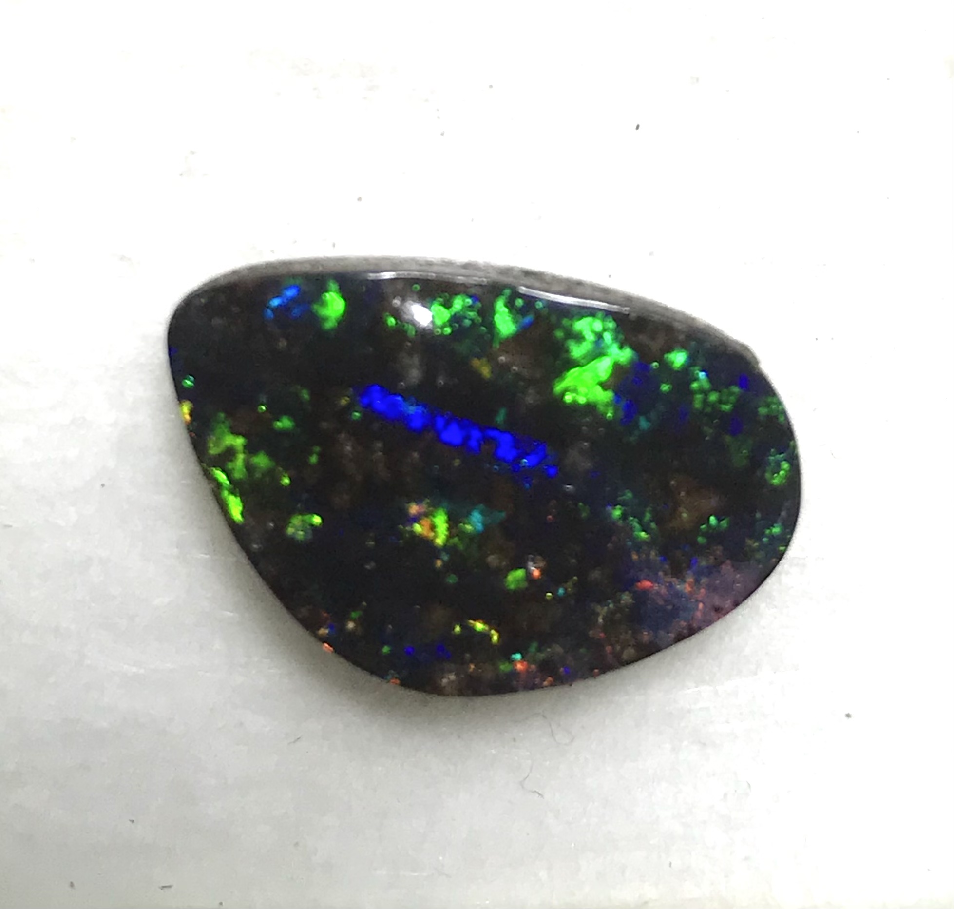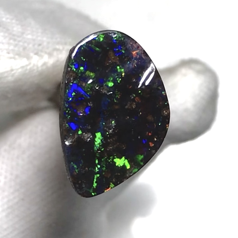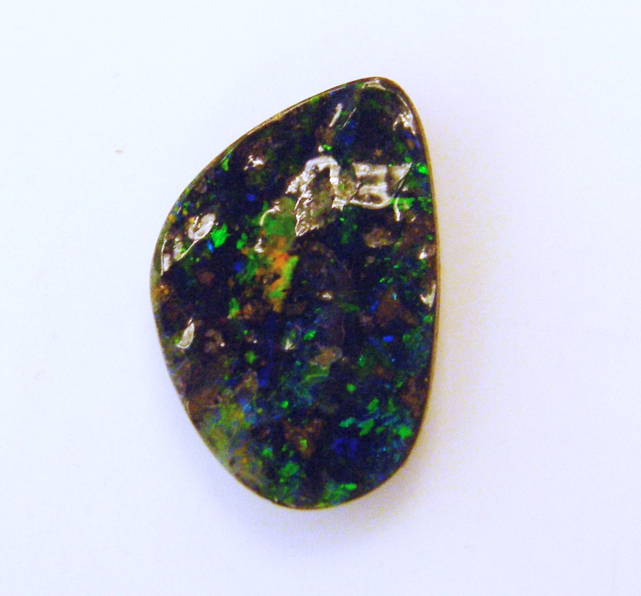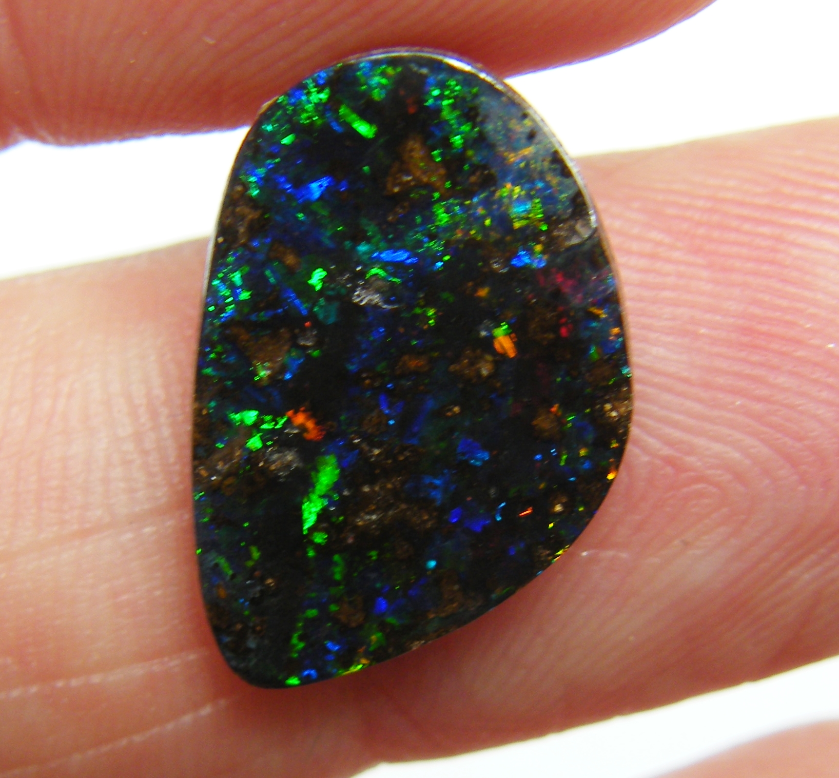 Beautiful rich multicolours sparkle from this natural Australian boulder opal from our mine in western Queensland. There is also a hint of orange and royal blue amongst the green. It has an undulating surface where we have followed the opal vein using fine tools. It is highly polished.