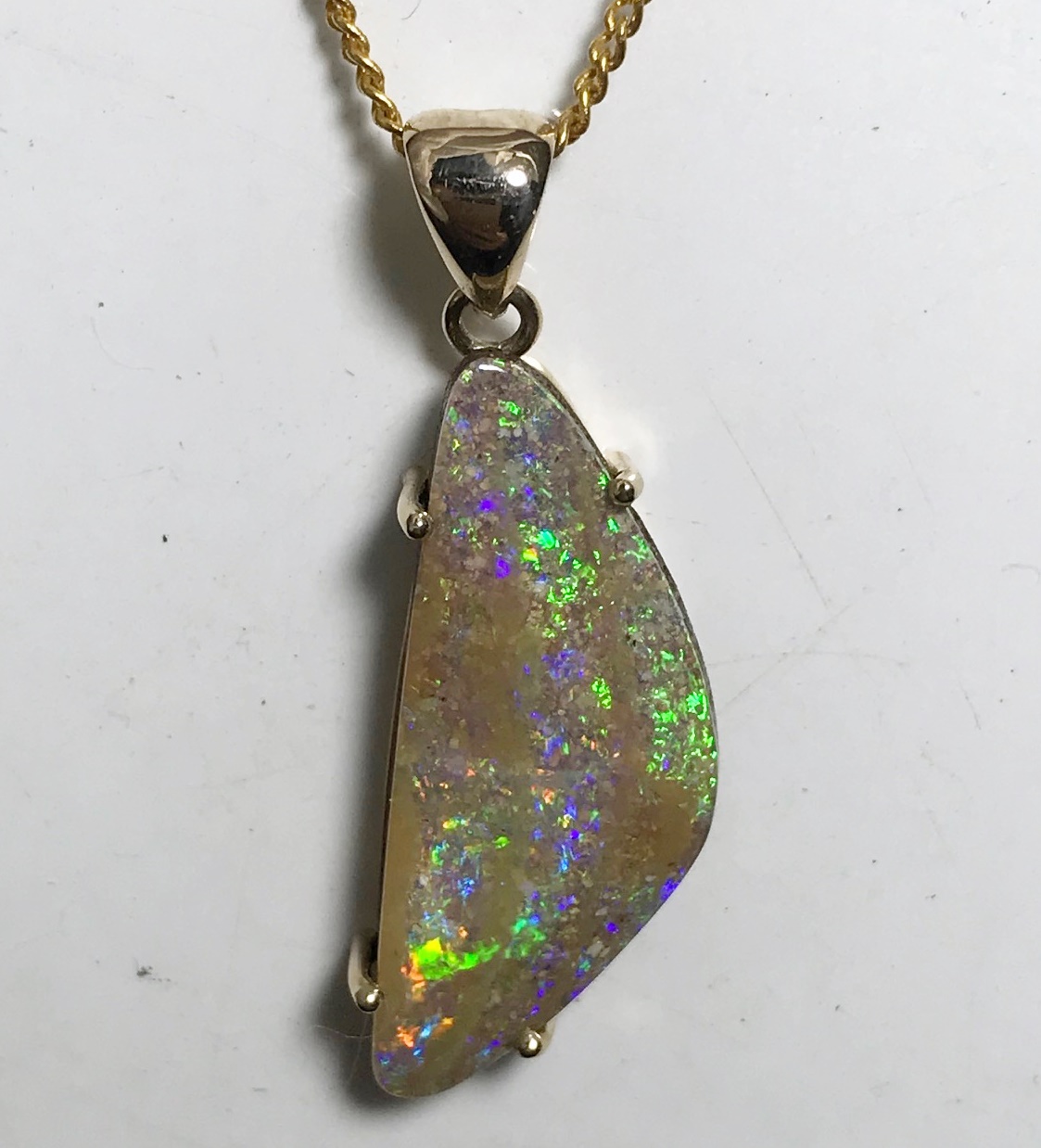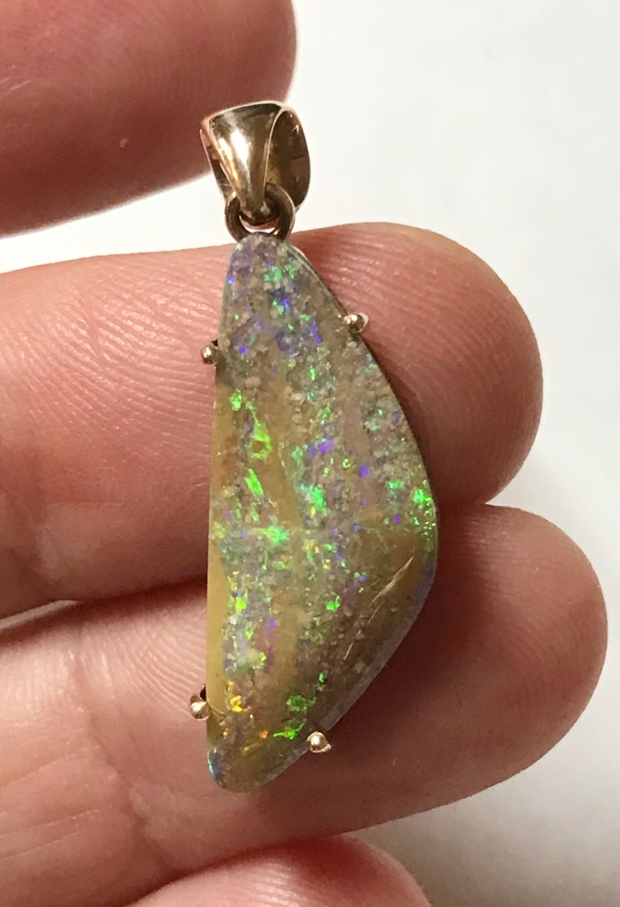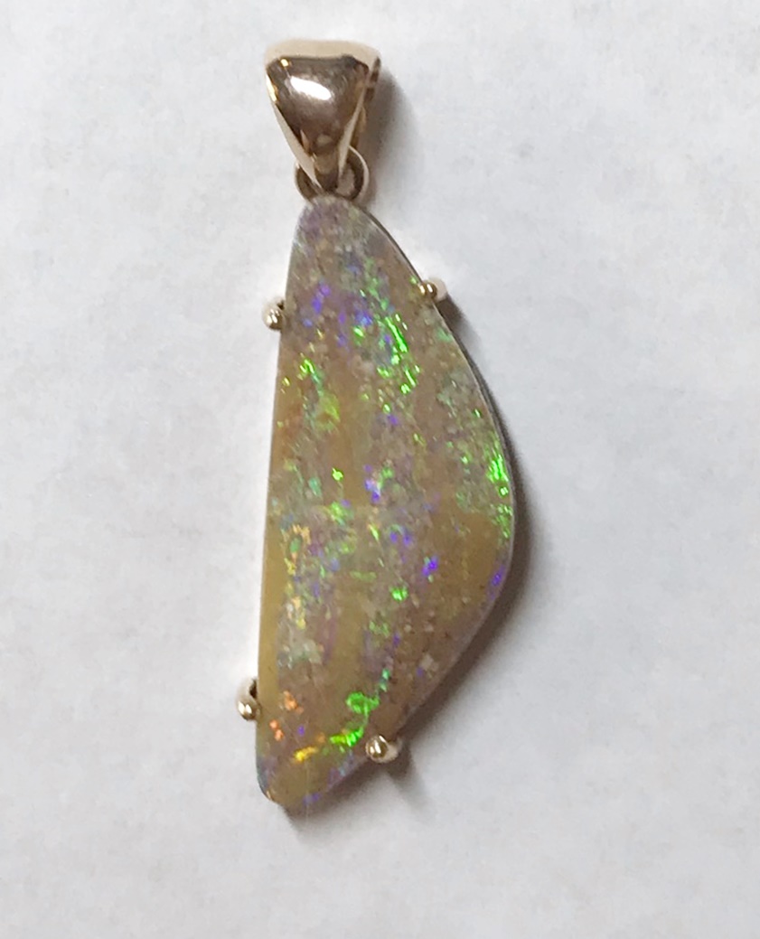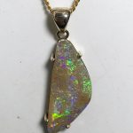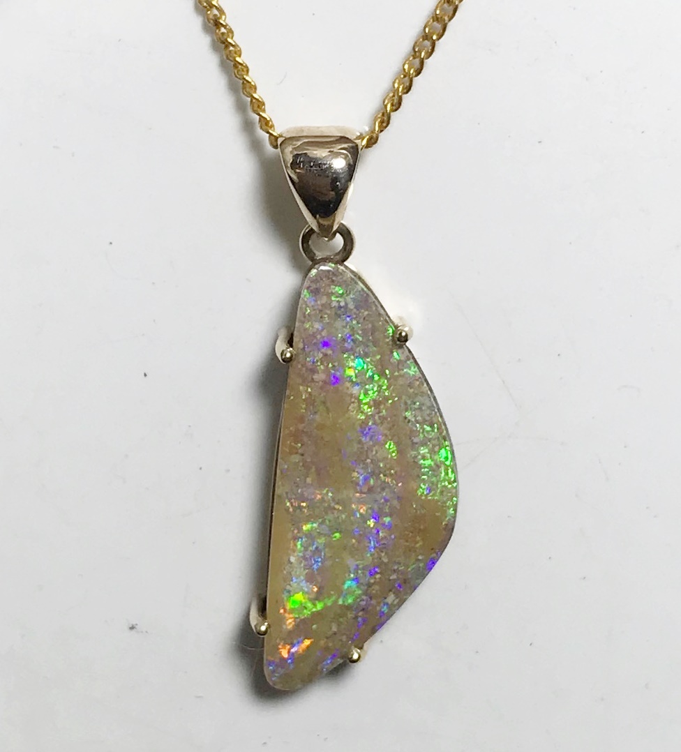 Sparkles of predominantly lime green move across the face of this natural Australian boulder opal from our mine in western Queensland. It has been quality cut and polished and set in a solid 9carat yellow gold claw setting with swinging bail. Comes with a quality gold plated chain. Chain size can be either 45cm or 50cm. Please advise.