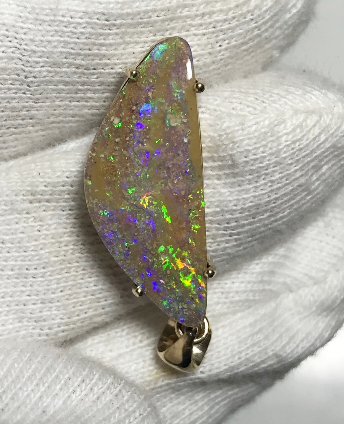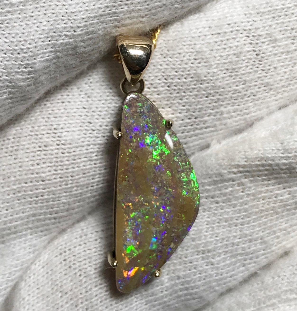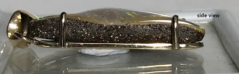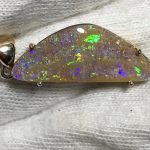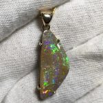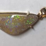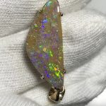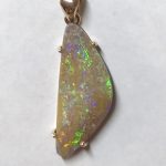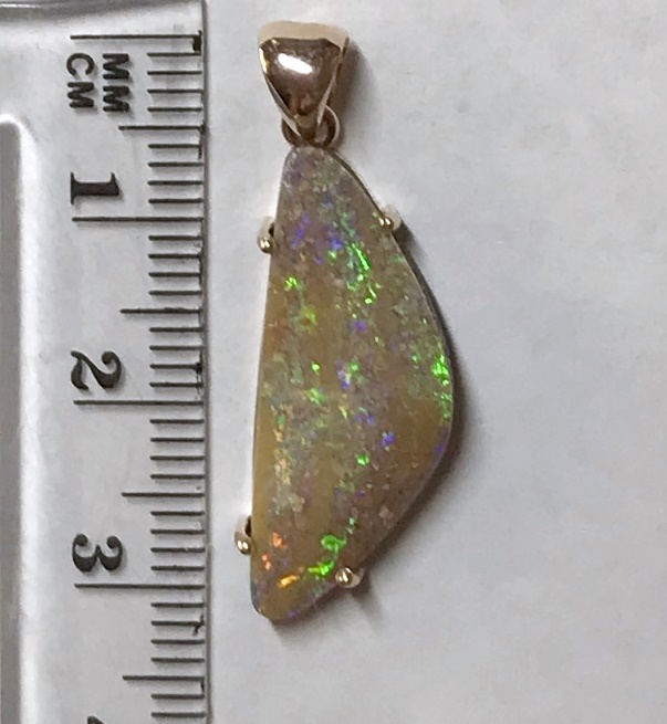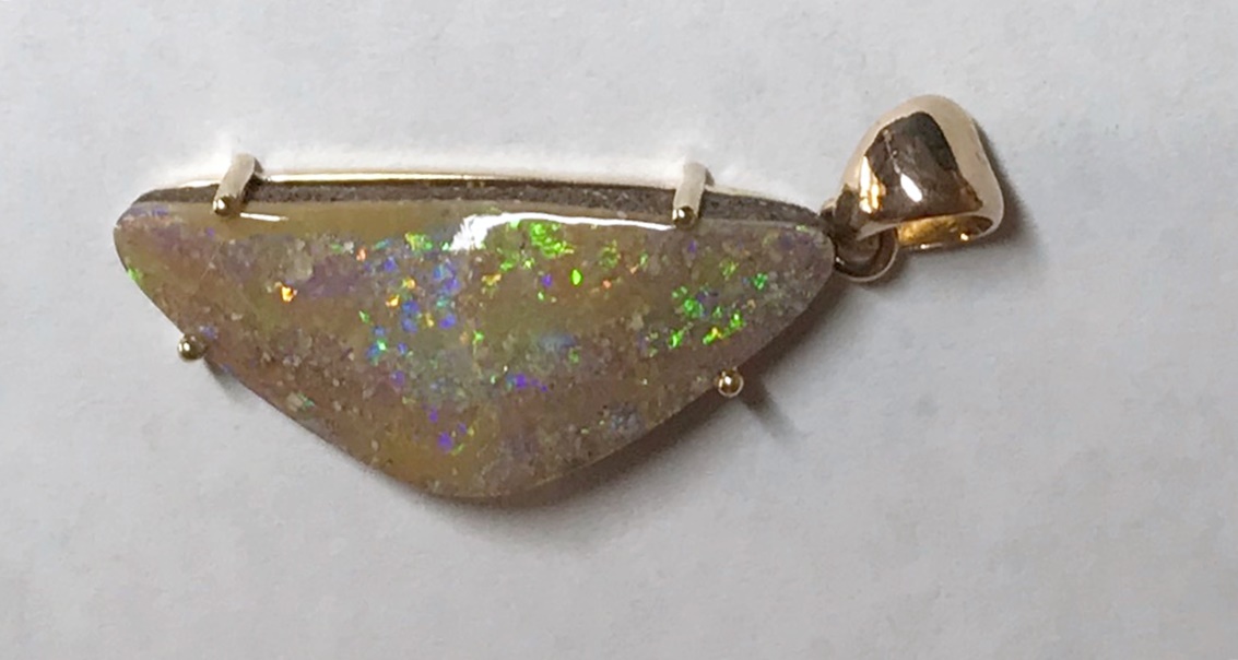 Sparkles of predominantly lime green move across the face of this natural Australian boulder opal from our mine in western Queensland. It has been quality cut and polished and set in a solid 9carat yellow gold claw setting with swinging bail. Comes with a quality gold plated chain. Chain size can be either 45cm or 50cm. Please advise.