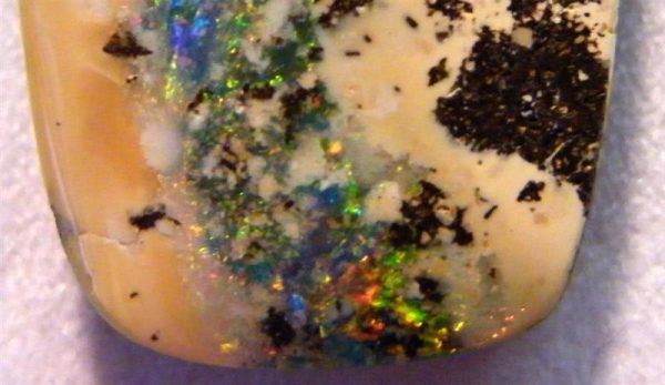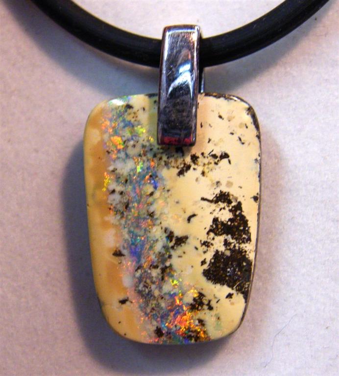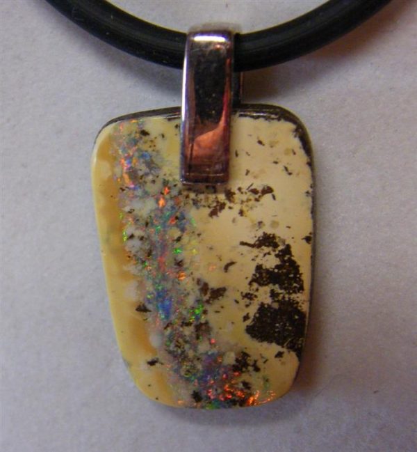 Bright colourful sparkles of orange and green. There is ironstone in the face of this natural solid Australian boulder opal which is normal for this quality of opal. It has a sterling silver 925 bail attached to it and placed on a 45cm long 2mm black rubber necklace with magnetic clasp.