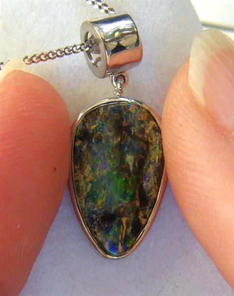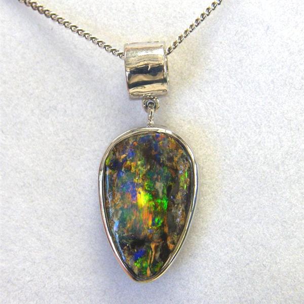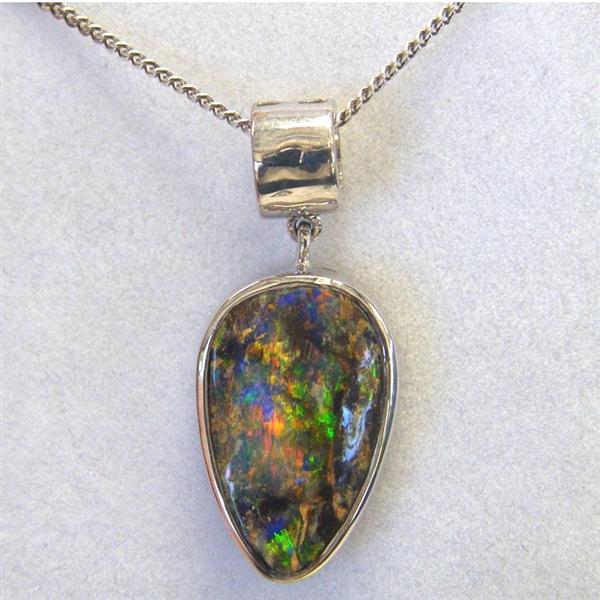Quality crafted opal pendant with cast swinging bail in 925 sterling silver and rhodium plated to prevent tarnishing. The opal is a natural and rare Australian wood replacement boulder opal with an orange rolling flash (not a doublet). The opal is from our mine in the Quilpie district in western Queensland.