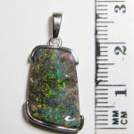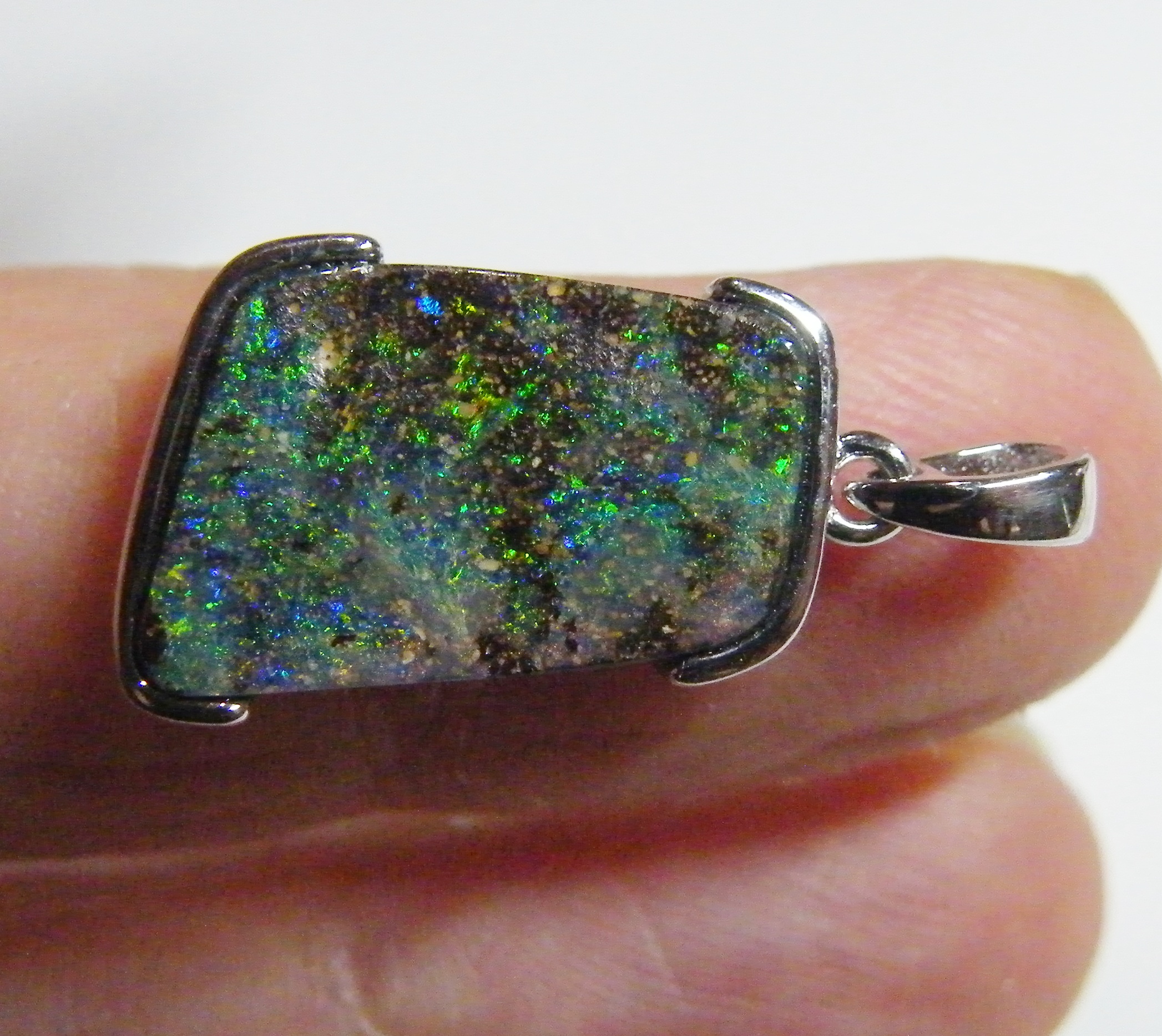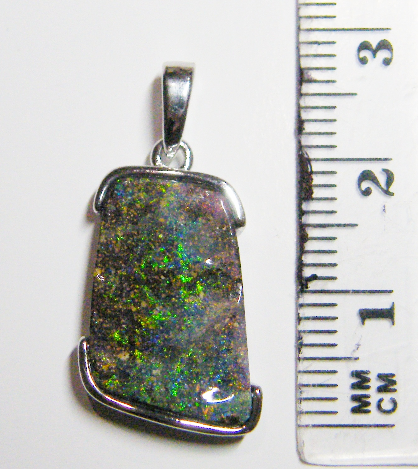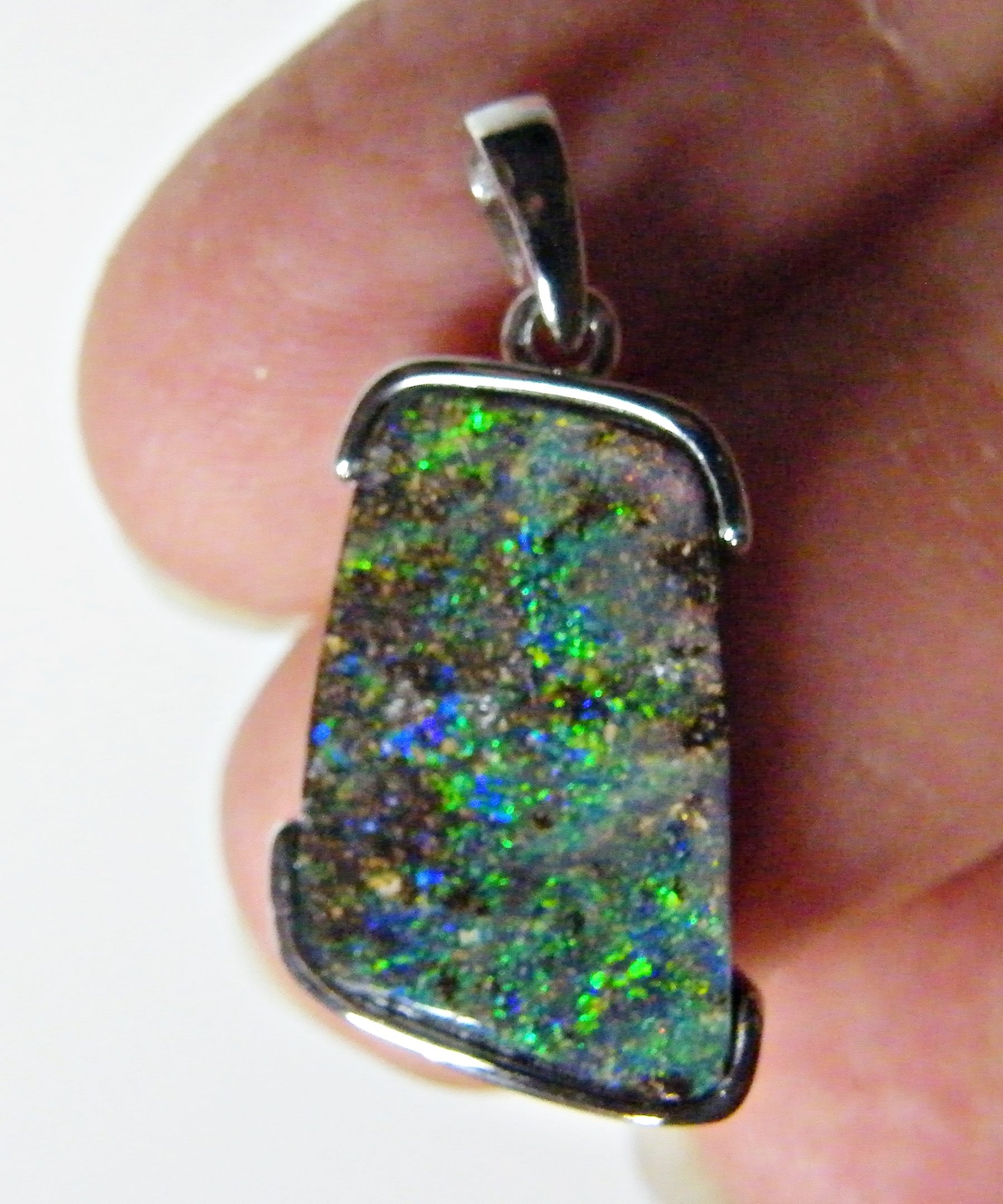 Predominantly green sparkles from this natural Australian boulder opal from our mine in western Queensland. There is also a hint of pink down the side along with some ironstone in the face, which is normal for this quality of opal. The face of this opal has a slight undulating texture and is highly polished. It is set in 925 solid sterling silver and comes with a 45cm solid sterling silver chain and polishing cloth.