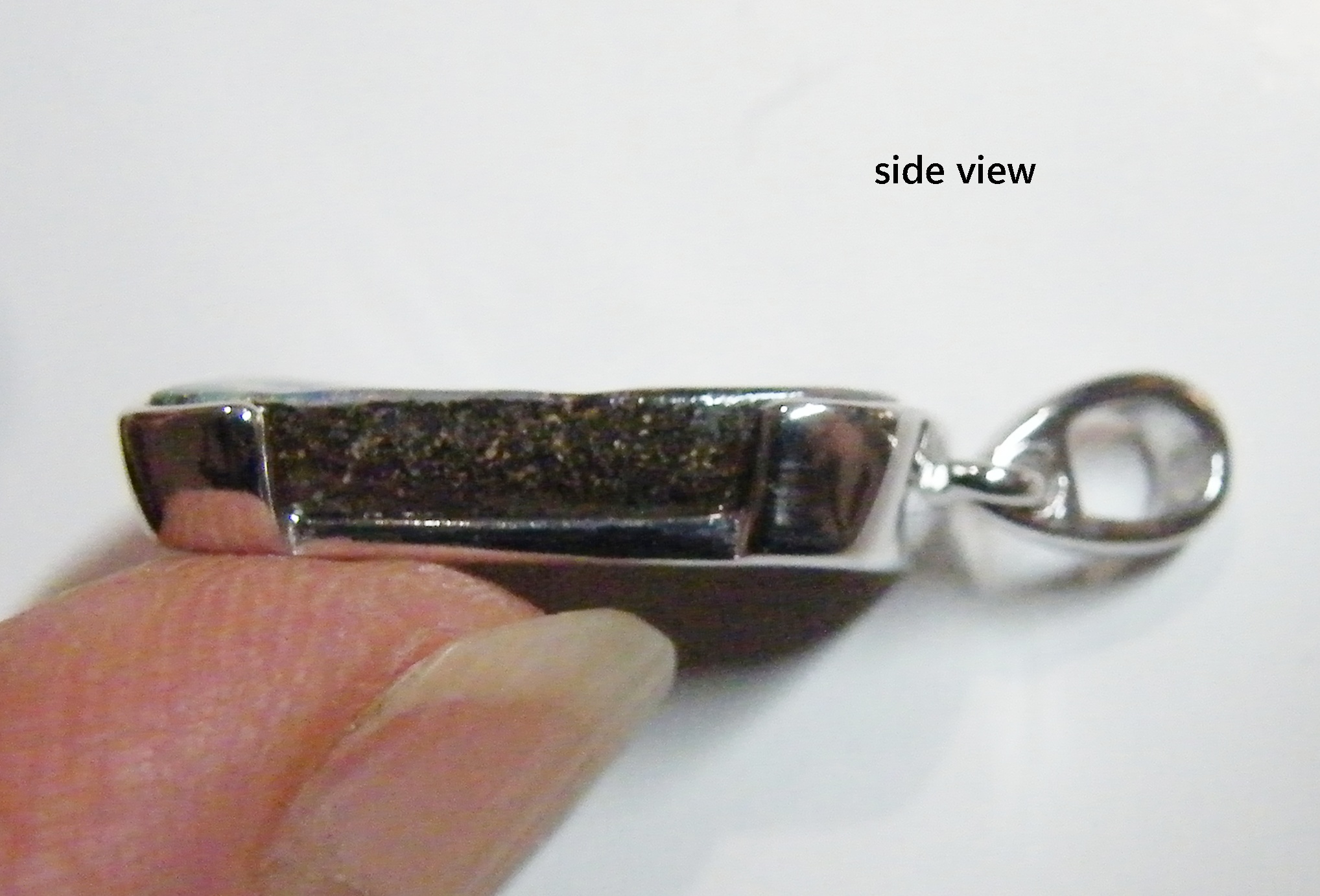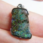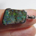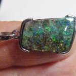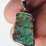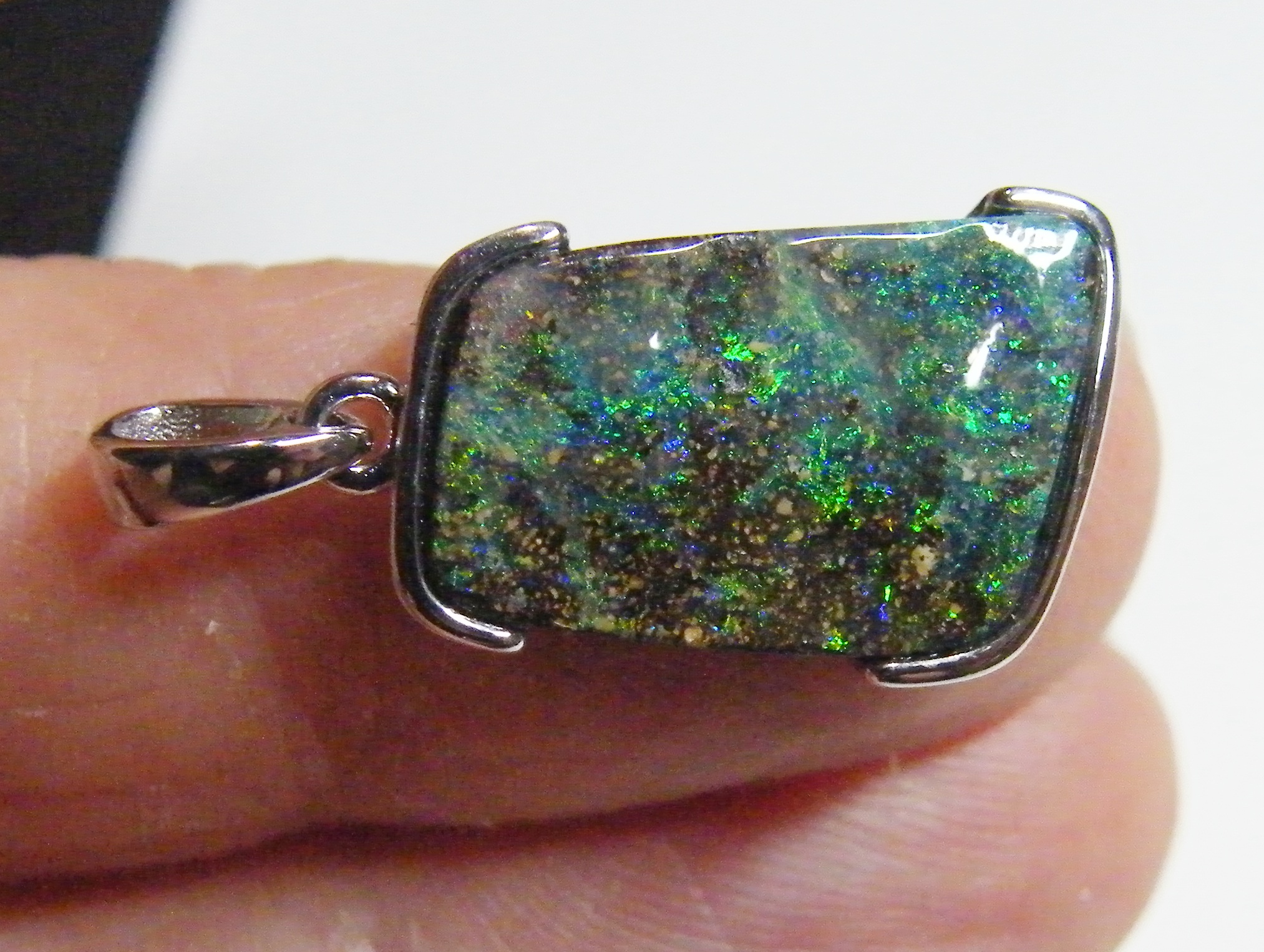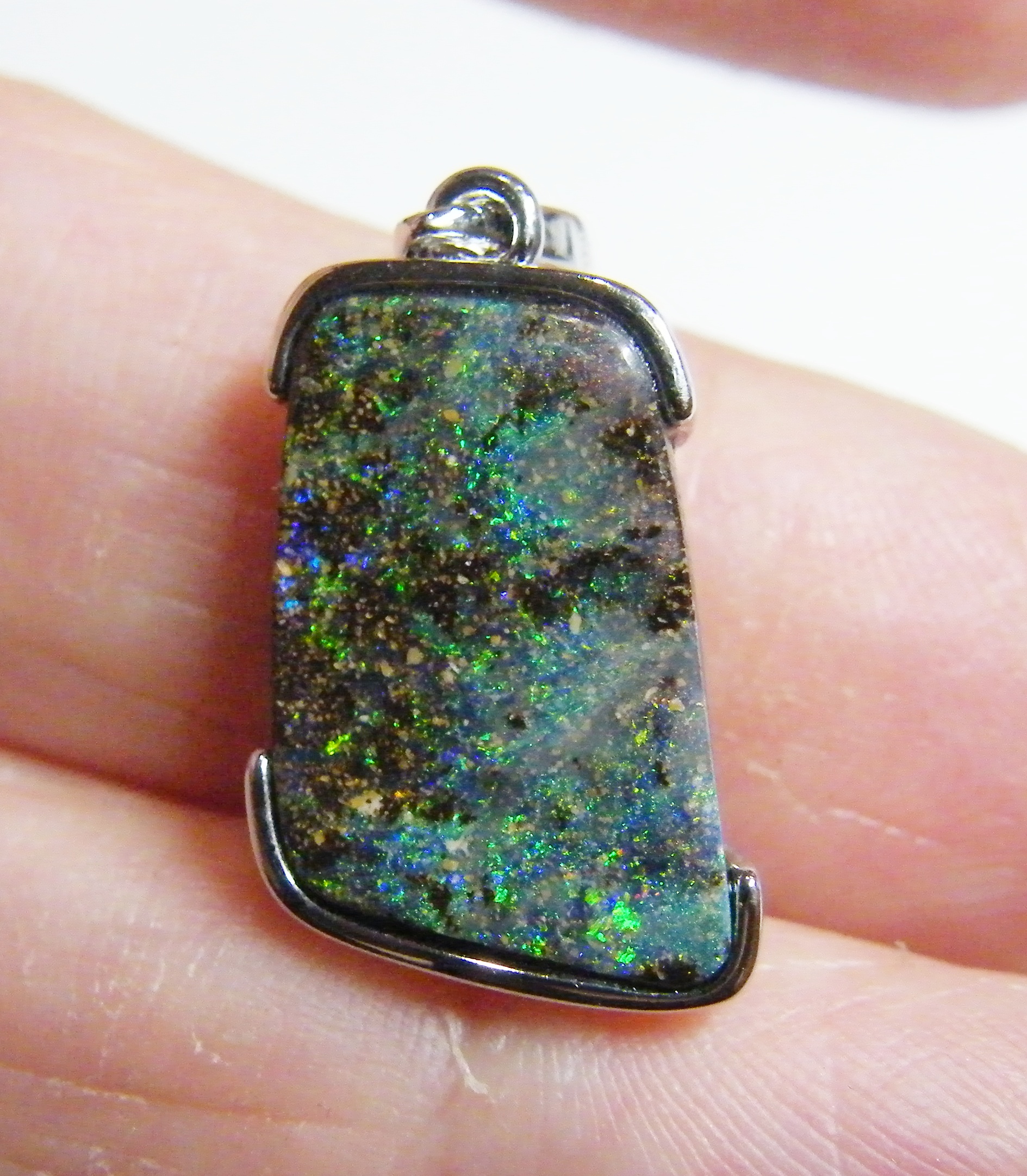 Predominantly green sparkles from this natural Australian boulder opal from our mine in western Queensland. There is also a hint of pink down the side along with some ironstone in the face, which is normal for this quality of opal. The face of this opal has a slight undulating texture and is highly polished. It is set in 925 solid sterling silver and comes with a 45cm solid sterling silver chain and polishing cloth.