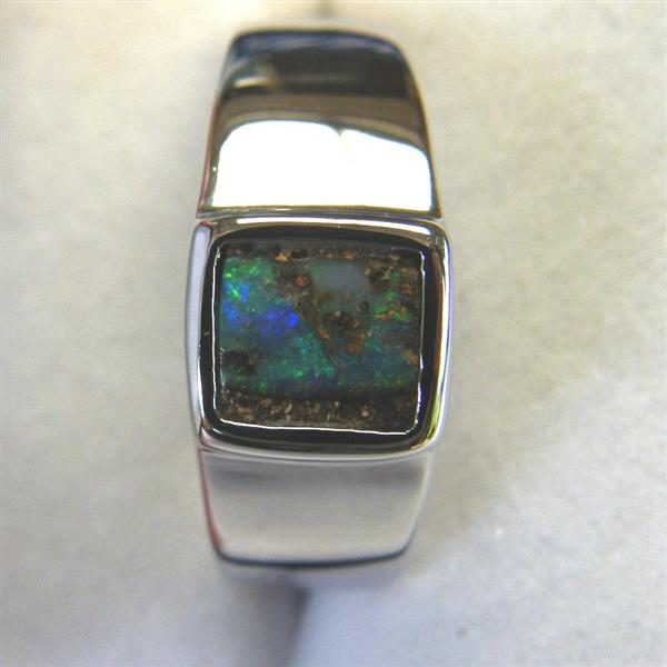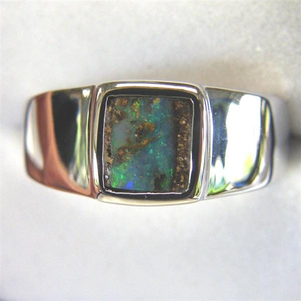 Bright green shines through this solid Australian pipe opal with stabilised sandstone. It is set in solid 925 sterling silver. There is a small flaw in the opal appearing as a fine line across the stone. This is still beautiful ring and the small flaw will not reduce its wearability and does not detract from the aesthetic appeal but we are offering it for sale at a reduced price because of the fine crack.
