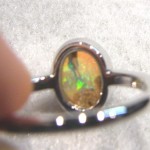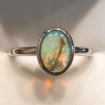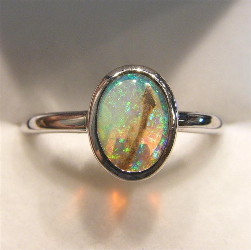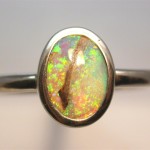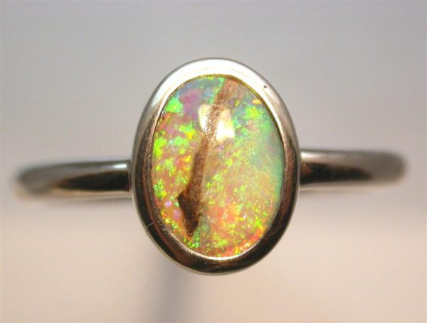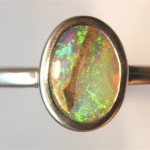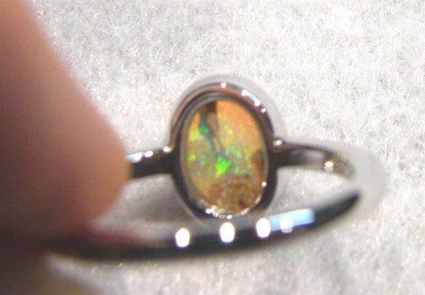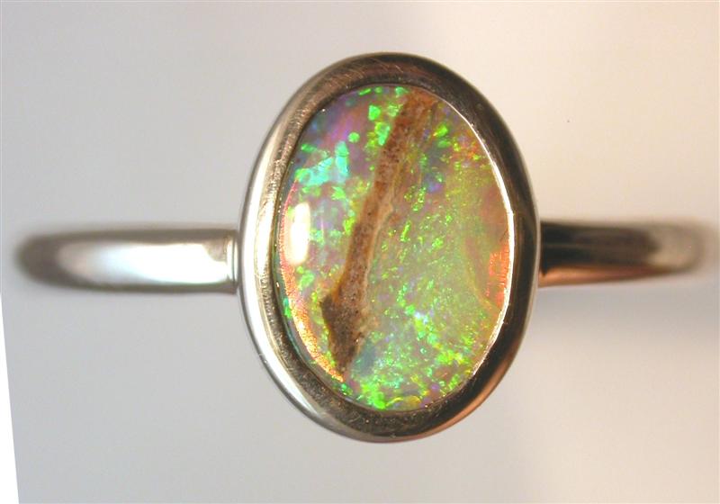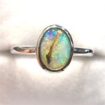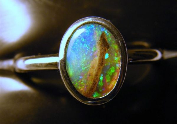 Pipe opal occurs when fragments of tree roots or any organic material are trapped in sediments on an opal level and in time some of resulting cavaties are replaced by potch or precious opal. The sandstone has been stabilised with a polymer resin to increase strength and durability and avoid chipping during setting process. (Not a doublet)
