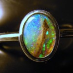Quality handcrafted in solid 925 sterling silver comes this pipe opal from our mine in the Quilpie district in western Queensland. It displays flashes of green in different shades. It has a sandstone bar running through it and a small amount natural adhering sandstone still on the back from otherwise a solid crystal opal.